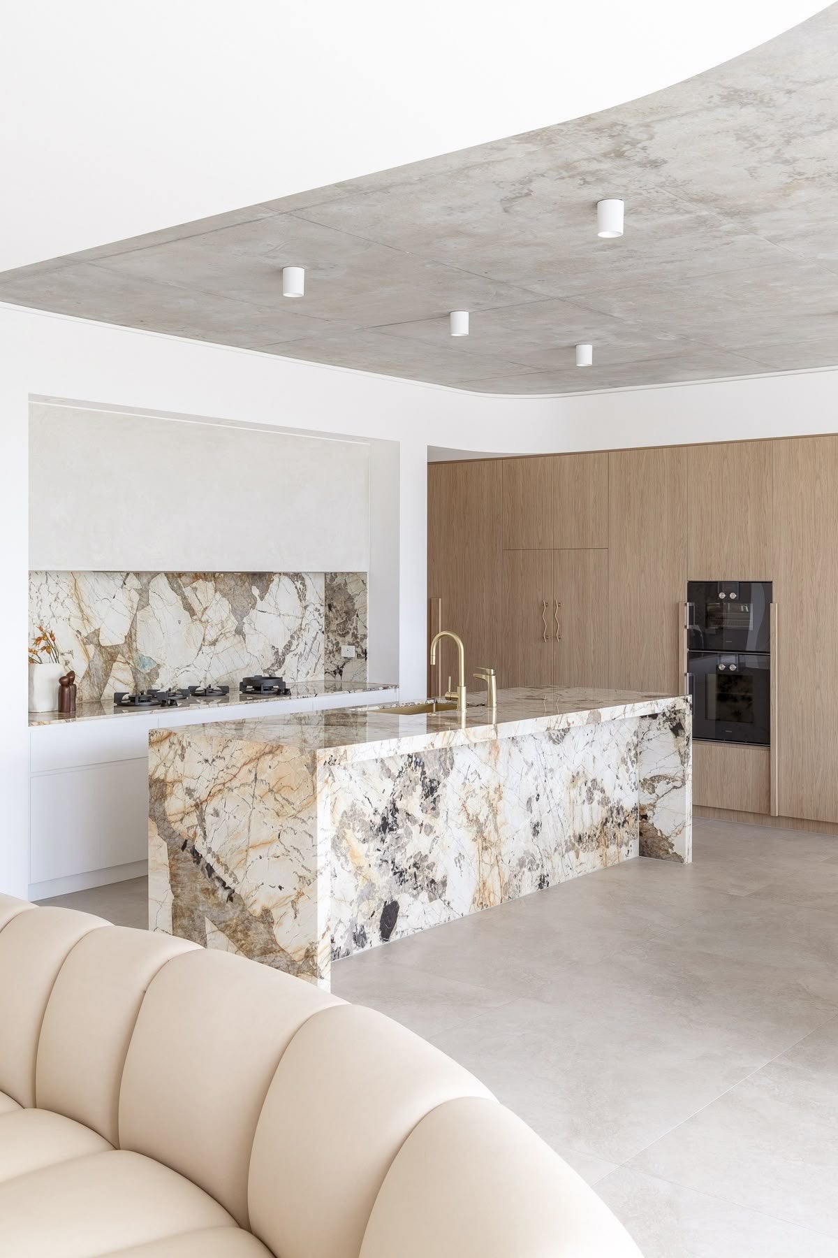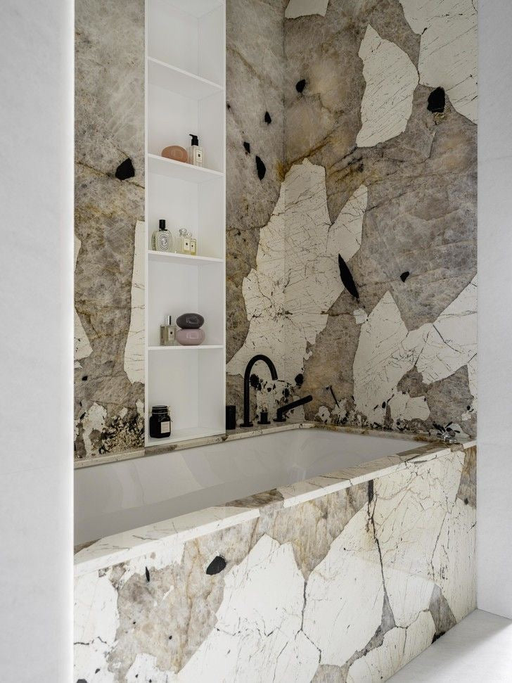 Patagonia quartzite, one of the most exceptional and valued stones existing in nature. The richness in colors and textures captivate the senses in this slab. Deep black, brown and golden hues with shades of translucent gray make up the stunning color palette, enlivened by a pure-white backdrop.